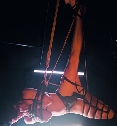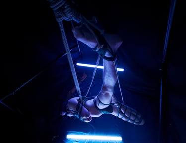 We tie with intention—building custom rope patterns and suspensions that honor the body’s lines and the trust between participants. Sessions can be documented in atmospheric, high-contrast images with dramatic lighting in deep blues, rich reds, vivid purples, and soft shadows. I can personally capture the work, or we can connect you with trusted professional photography partners for high-quality results of the process and results—whichever best serves the vision.